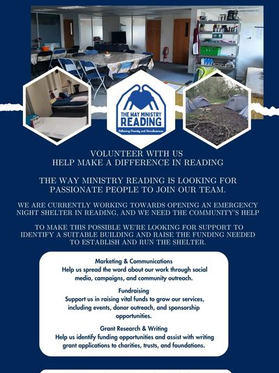 The Way Ministry, Reading is a local charity supporting people experiencing homelessness, poverty and financial hardship in Reading.